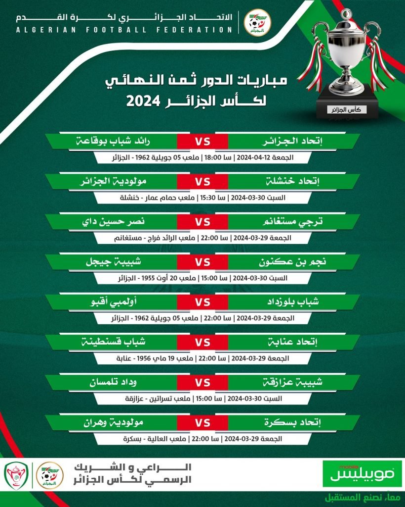 أعلنت لجنة تنظيم كاس الجمهورية، اليوم الأربعاء، عن مواعيد وتوقيت إجراء مواجهات الدور الثمن نهائي من المنافسة والتي ستلعب نهاية الأسبوع القادم.