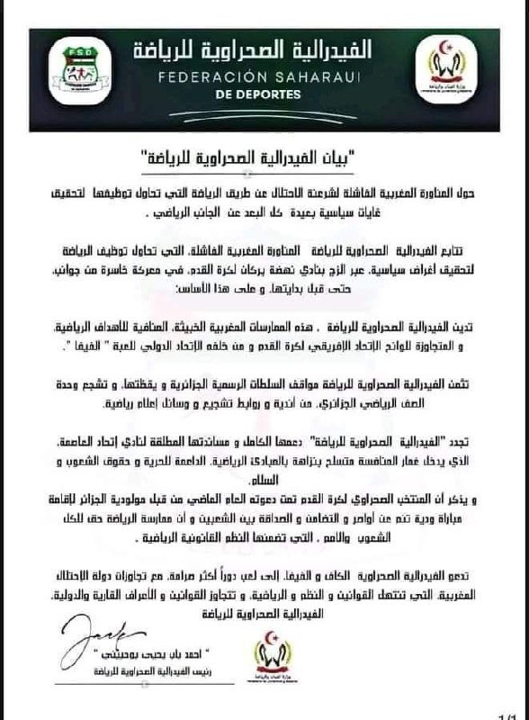 الفيدرالية الصحراوية للرياضة تساند إتحاد الجزائر