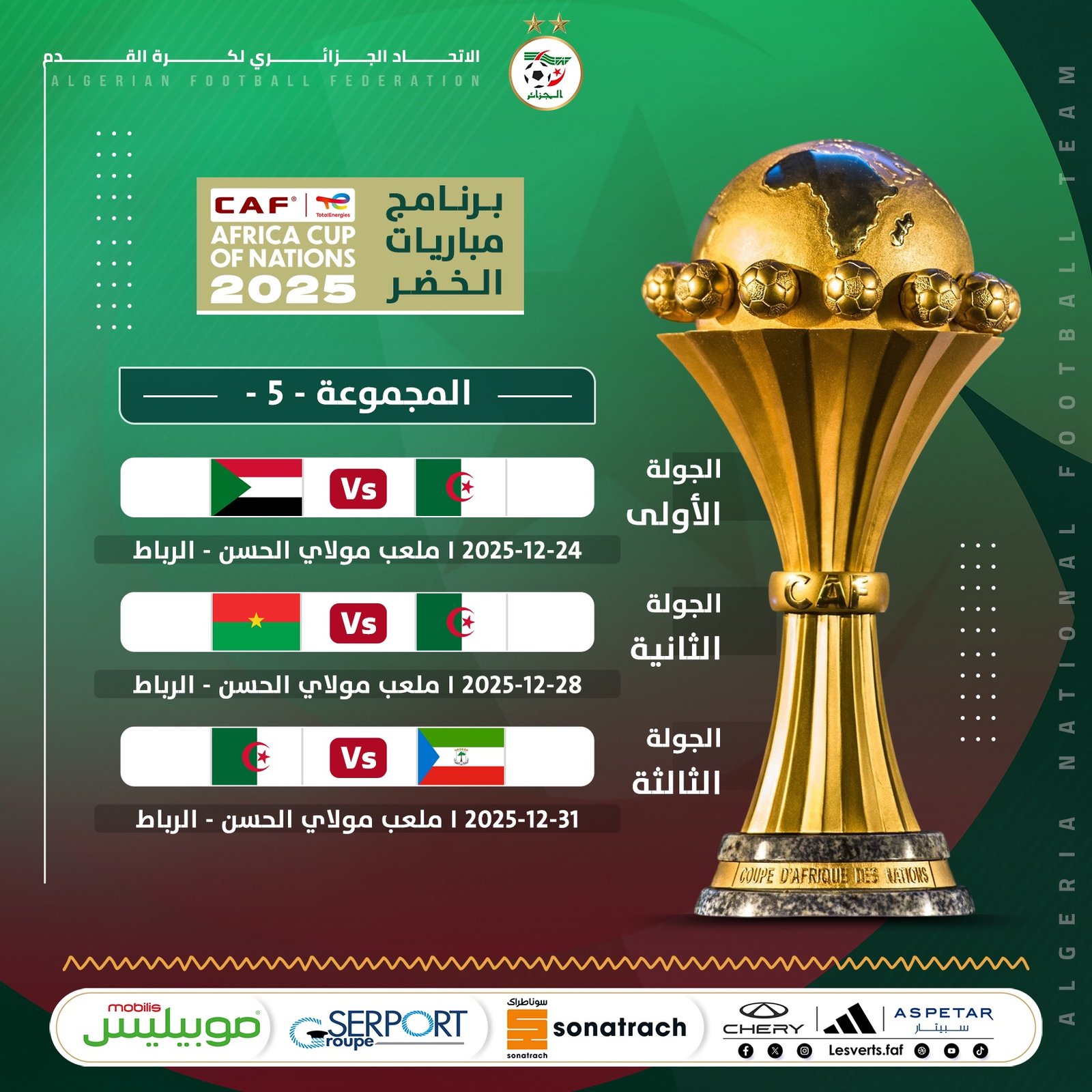 أعلن الإتحاد الجزائري لكرة القدم (فاف) عن مواعيد مواجهات المنتخب الجزائري خلال البطولة الإفريقية والتي جاء فيها الخضر بالمجموعة الخامسة والتي ضمت منتخبات بوركينا فاسو وغينيا الاستوائية والسودان.