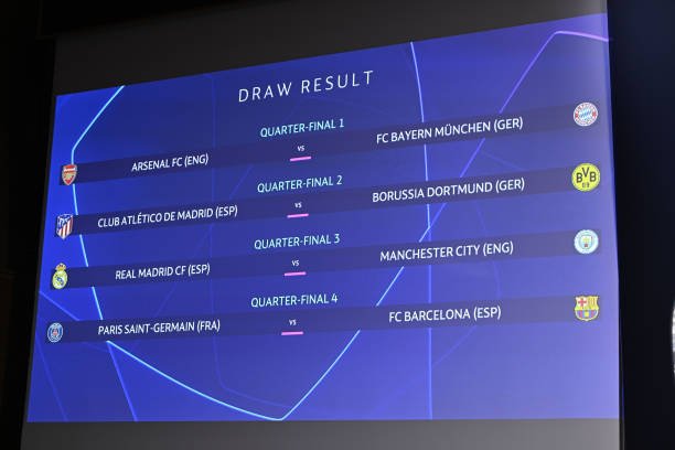 أما قرعة الدور قبل النهائي فأوقعت الفائز من مباراة أتلتيكو ودورتموند مع الفائز من لقاء سان جيرمان وبرشلونة، فيما يلعب الفائز من أرسنال وبايرن مع الفائز من مواجهة الريال ومانشستر سيتي.